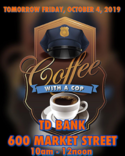 Residents, visitors, family, and friends.... All are welcomed to join the Elmwood Park Police Department for Coffee with a Cop at the TD Bank located at 600 Market Street in Elmwood Park between 10 am and 12 noon. Come interact with officers and exchange conversation over coffee.